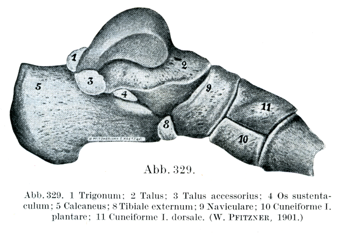 [図329]1三角骨Trigonum,2距骨,3副距骨Talus accessorius,4載距突起骨Os sustentaculum,5踵骨,8外脛側骨Tibiale externum,9舟状骨,10底側第一楔状骨Cuneiforme I plantare,11背側第一楔状骨Cuneiforme I. dorsale(W. Pfitzner,1901)