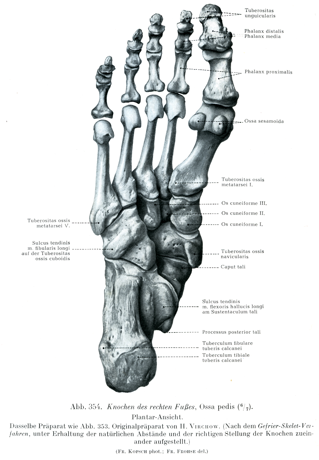 [図354]足の骨(右)足底面(6/7) 図353と同一のH. Virchow作製の標本(凍結骨格処理法によって,骨の相互の自然の間隔と正しい向きを保って組立てられている)