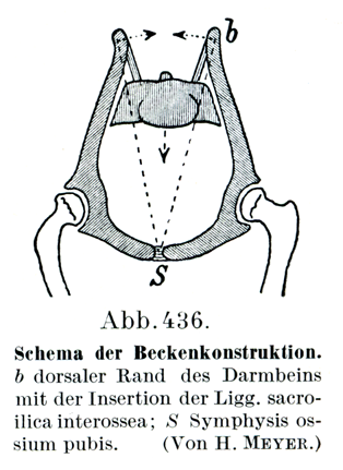 b腸骨の背側縁,ここに骨間仙腸靱帯が付いている.s 恥骨結合.(H. Meyerによる)