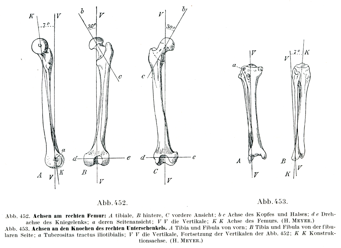 [図453] 右の下腿骨の軸 Aは脛骨と腓骨を前方から,Bは外側から見たところ. aは腸脛靱帯粗面,VVは鉛直線で,図452の鉛直線のつづき,KKは構成軸.(H. Meyer)