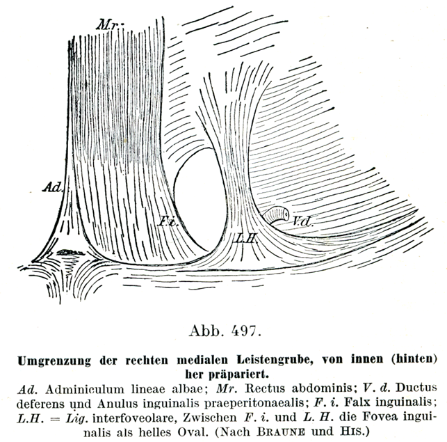 [図497] 右の内側鼡径窩とその周囲, 内部(後方)から解剖したもの Ad. 白線補束;Mr. 腹直筋;V. d. 精管および腹膜下鼡径輪;F. i. 鼡径鎌;L. H. 窩間靱帯. F. i. とL. H. との間に鼡径窩が明るい卵円形として示されている.(BrauneおよびHisによる)