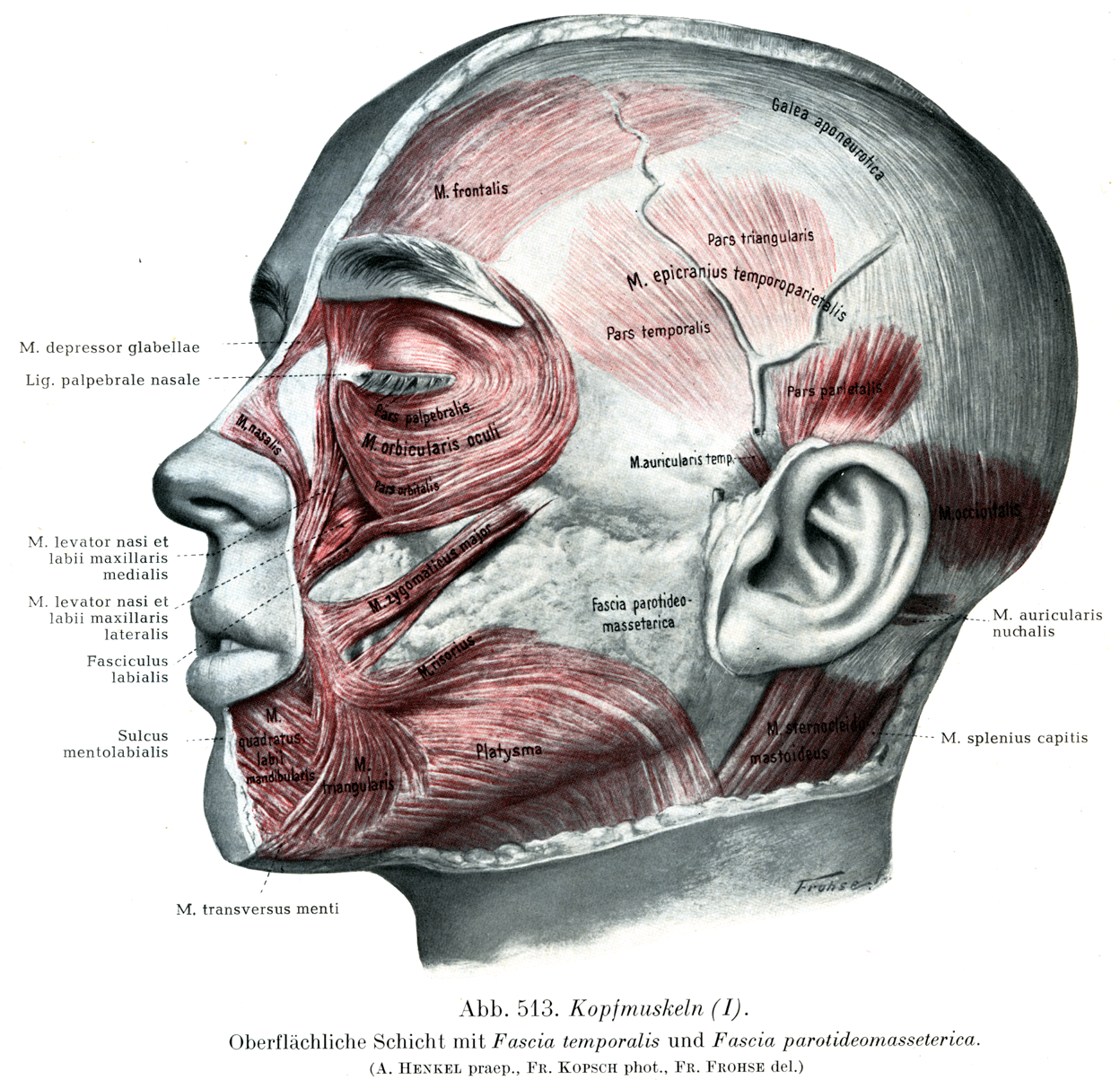 [図513] 頭部の筋(I) 浅層, 側頭筋膜Fascia temporalisおよび耳下腺咬筋膜Fascia parotideomassetericaは残してある.