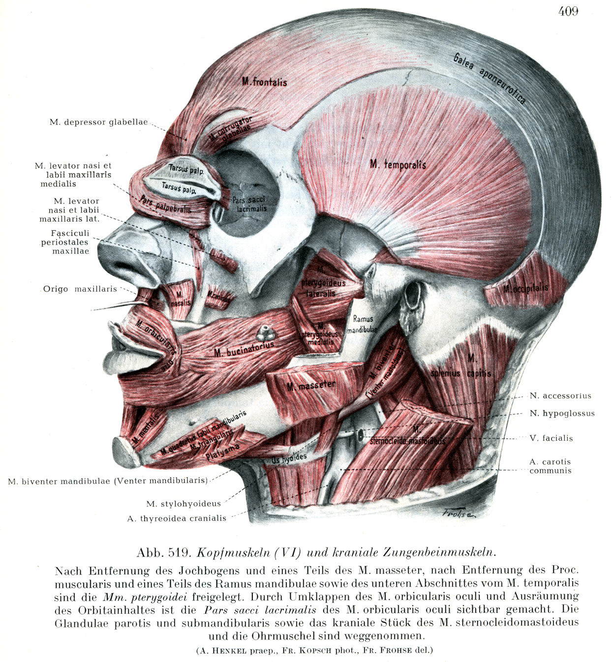 [図519] 頭部の筋(VI)および舌骨上筋 頬骨弓を取り去り咬筋の一部,下顎骨の筋突起,下顎枝の一部ならびに側頭筋の下部を取り除き,翼突筋群を剖出してある.眼輪筋を反転し,眼窩の内容を取り除いて眼輪筋の涙嚢部がみえるようにしてある.耳下腺と顎下線ならびに胸鎖乳突筋の上部および耳介を取り除いてある.