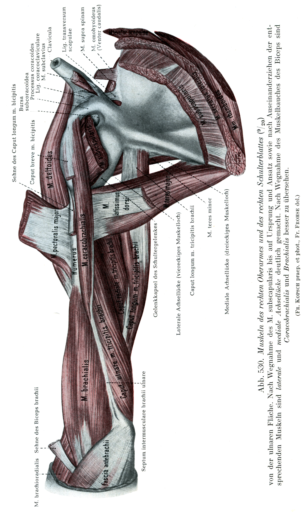 [図530] 右の上腕および肩甲骨の筋(9/20) その尺側面を示す.肩甲下筋を起始および停止の近くまで取り除き,また近傍の諸筋を引き離して内側, 外側両腋窩裂をはっきりわかるようにしてある.上腕二頭筋の筋腹を取り除き,烏口腕筋および上腕筋がよくみえるようにしてある.