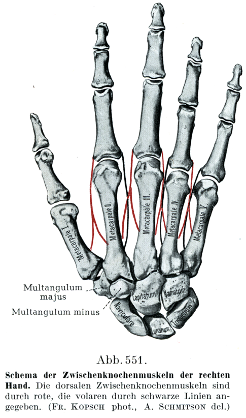 背側骨間筋は赤い線,掌側骨間筋は黒い線で示す.