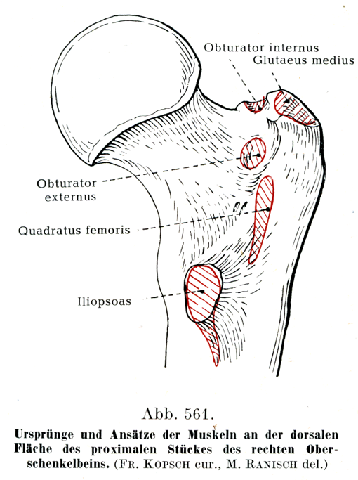 右大腿骨の上部の後面における筋の起始と停止