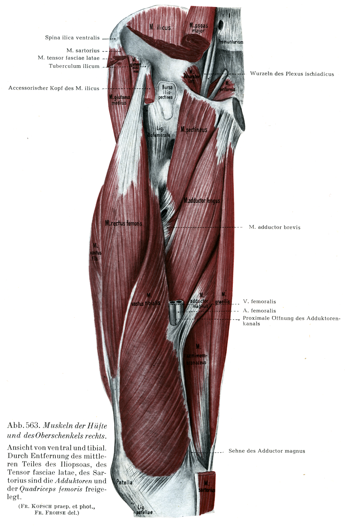 [図563] 寛骨部および大腿の筋(右側) 前および内側からみる.腸腰筋の中部,大腿筋膜張筋,縫工筋を取り去って内転筋群 および大腿四頭筋を剖出してある.