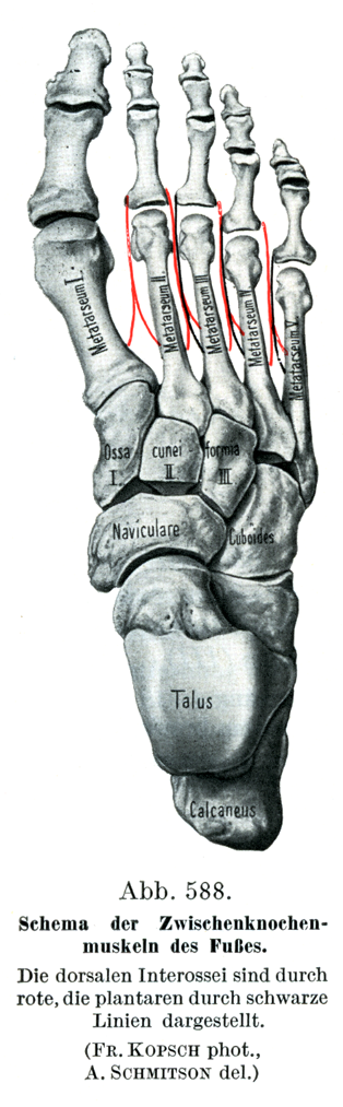 背側骨間筋は赤い線,底側骨間筋は黒い線で示す.