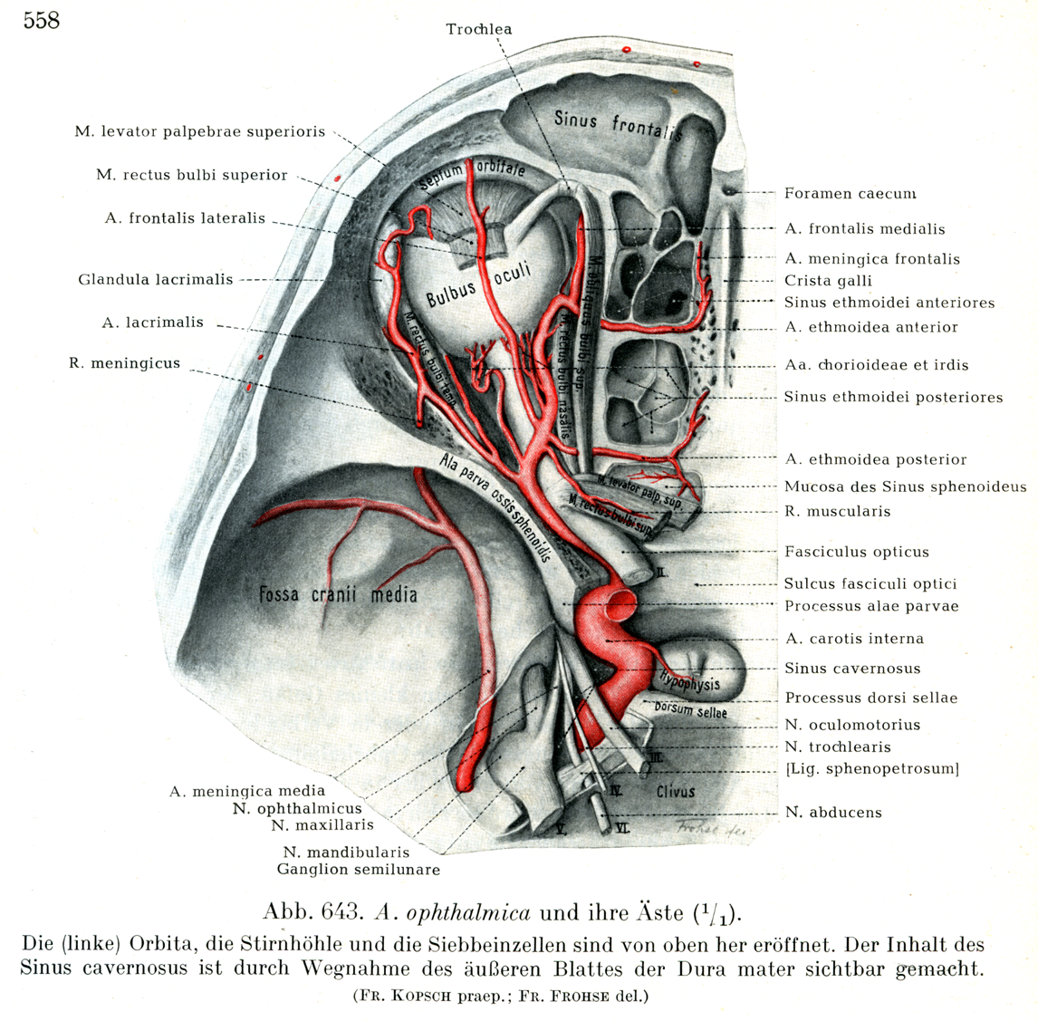 眼窩(左).前頭洞, 論骨洞は上方から開いてある.海綿静脈洞の内容を示すために硬膜の外葉を取除いてある.