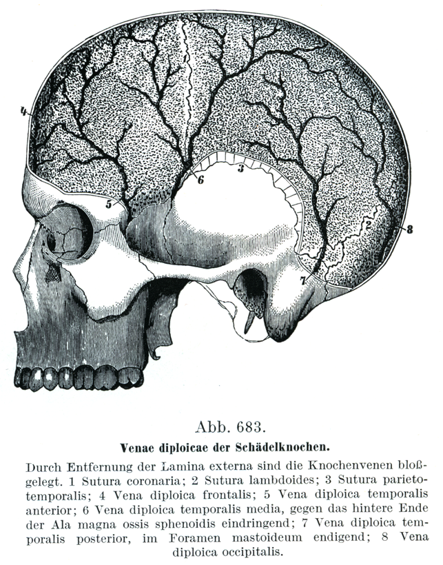 [図683] 頭蓋骨の板間静脈. 外板を取り除いて板間静脈を示してある.1. 冠状縫合;2. 人字縫合;3. 頭頂側頭縫合;4. 前頭板間静脈;5. 前側頭板間静脈;6. 中側頭板間静脈(蝶形骨大翼の後端に進入する);乳後側頭板間静脈(乳突孔で終る);8. 後頭板間静脈