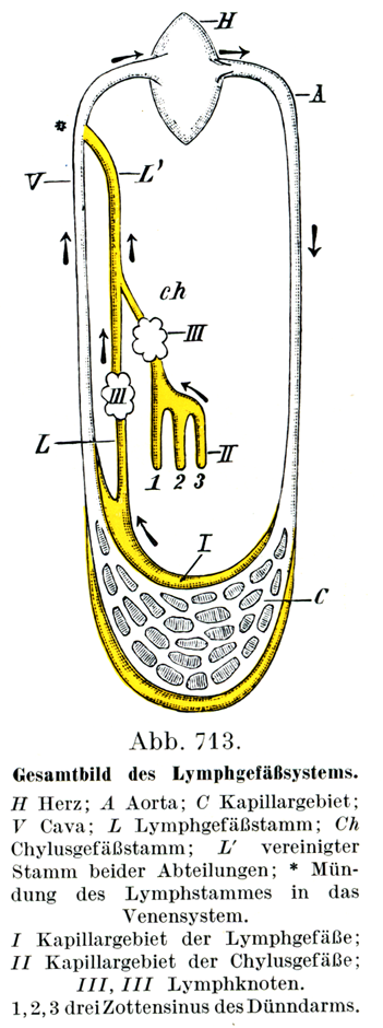 H 心臓;A 大動脈;C毛細管の領域;V 大静脈;L リンパ管の幹;Ch乳ビ管の幹;L'2つの部分が合してできた幹;* リンパ管の幹が静脈系に開くところ. I リンパ管の毛細管領域;II乳ビ管の毛細管領域;III, III リンパ節;1, 2, 3, 3つの小腸絨毛洞.