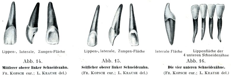 b)下の切歯.これらはすべての歯のうちで最も小さいものである.ことに下の内側切歯(下顎の第1切歯あるいは中切歯)が小さい.歯冠の前面は長めの4辺形であり,接触面からみると歯冠がかなりのみの形に近い.前面は多くは平滑で高低がなく,ただまれに縦の溝をもつのみである.縦の方向にも横の方向にも膨らみを呈することがごく少ないので,歯冠前面の弯曲のぐあいで左右を見わけることははなはだ困難である.後面は縦の方向に凹であって,横の方向にはごくわずかにへこんでいるのみ.辺縁隆線Randleistenはほとんど見られない.後面の下部にある結節は上の切歯におけるほどその境がはっきりとしていないが,しかし接触面からみたときに最もよく分るようにかなり著しく突出している.なお接触面からみて分ることは,前面と後面が歯冠の中央の高さまでは相近づいていて,それより歯根の方に向かってだんだんとたがいに遠く離れるようになる.下の切歯の切縁は直線的である.この切縁が下の内側切歯ではその両側の接触面とほとんど直角を呈している.したがって下の内側切歯では隅角徴によっても左右を区別することができない.しかし下の外側切歯ではそれがしばしば可能である.もっともこの場合も磨滅によってその目標がまもなく消えてしまう.そのときにも外側の接触面の走り方が(この歯の前面を前方からみるとき)斜めの方向に下内側から上外側にのびているということが左右の外側切歯を区別する1つの目標になる.しかしこの目標はいつも明瞭であるとはいえない.歯根は側方から押された形で,両接触面に浅い縦の溝をもっている.この縦溝は外側面にあるものが必ずいっそう深い.歯根が1つの縦溝しか持たないときは,それがいつも外側面にある.この点が下の切歯で右と左のものを見わける1つの重要な補助手段である.下の内側切歯の根はしばしばまっすぐに伸びており,外側切歯の根は外側に曲がっていることが多いが,これが内側に曲がっていることも時おりある.