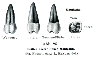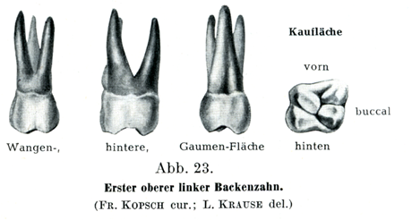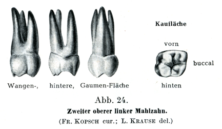 α)上の第1大臼歯:咀嚼面は菱形であって,ここに頬側に2つと口蓋側に2つの咬頭がある.これらの高まりが2つの縦溝と1つの横溝によってへだてられて,これらの溝がいっしょになって,歯列弓の方向に対して斜めにおかれたH字形をあらわしている.前方の縦溝は前方の接触面からおこって頬面に終わっており,後方の縦溝は後方の接触面から口蓋面にいたり,さらに口蓋側の根にまでつづいている.横溝はこれら2つの縦溝の中央をたがいに連ねる.H字形は咀嘘面のなかに対称的にあるのではなくて,後方かつ頬側にかたよっている.したがって前方の口蓋側咬頭が最も大きくて後方の口蓋側咬頭が最も小さい.しかし頬側咬頭は前後のものがほとんど同じ大きさである.しかしここに述べたような規則正しい形をしているのはむしろまれであって,次にいう2つの主な形がそのほかに区別される.その1つでは前方の口蓋側咬頭と後方の頬側咬頭とをたがいにむすぶエナメル質の1つの高まりの出現によってH字の横の溝がなくなっている.いま1つの主な形はカラベリ結節Tuberculum anomale Carabelli (日本人におけるカラベリ結節の頻度:29.3%(森),17.5%(山田),13.1%(馬).ヨーロッパ人では:11.2%(Terra),17.4%(Bolk),13.6%(Hillebrand).)とよばれる1個の小さい高まりが前方の口蓋側咬頭の口蓋面(内面)にある場合である.カラベリ結節の尖端はふつうは咀嚼面に達していない.頬面はほとんど鉛直に立っていて,中等度の膨らみを呈し,前方の接触面とは鋭い角をなして合し,後方の接触面とは鈍い角をなして合している.そのことは咀嚼面の方から歯冠をみると最もよくわかる.口蓋面はつよく膨らんでいて,後方の縦溝のつづきをもっており,時として第5の咬頭としてカラベリ結節をもっている.前後の接触面は平面的あるいは軽い凸をしめし,前方の接触面がいつも後方のものより大きい.ふつうに3つの根が存在し,それは頬側に2つと口蓋側に1つである.これらの根は前後の方向に押された形であって,その向いあった面にそれぞれ1つの縦溝をもっている.口蓋側の根は横断面が円くて,舌の方に向かった面に1つの溝をもっている.前方の頬側の根が最も幅がひろくて,また最も短い.3根は歯頚からたがいに離開する.頬側の根の尖端は後方にまがり,口蓋側の根の尖端は頬側(外方)にまがっている.頬側の根のいずれか1つが口蓋側の根と合一していることがある.また3根より多くの根が存在することもある.歯髄腔は容積が大で,歯の頚部のなかにあり,咬頭の数と同じだけの数の尖った突出部をもっている.