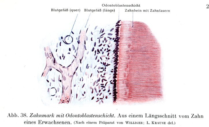 [図38] 歯髄とそのゾウゲ芽細胞層 成人の歯の縦断標本の一部.(Willigerの標本による).