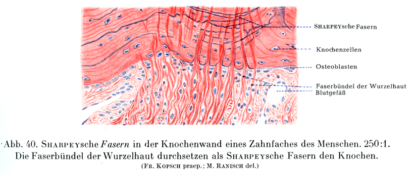 [図40] 上下の歯槽の骨壁におけるシャーピー線維×250.歯根膜の線維束がシャーピー線維として骨をつらぬく.
