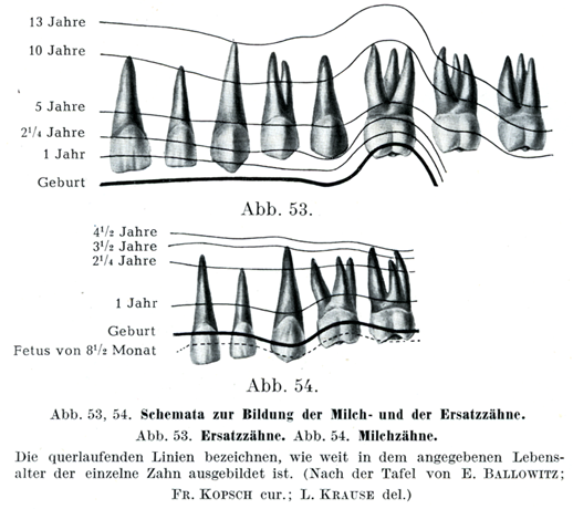 図53は永久歯, 図54は乳歯,横走する線は左に記してある年令において個々の歯がどこまで形成されているかを示すのである(E. Ballowitzの表による).