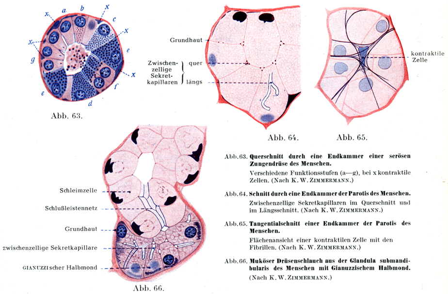 [図66」ヒトの顎下腺の粘液性の腺管とジアヌッチィ半月(K. W. Zimmermannによる)