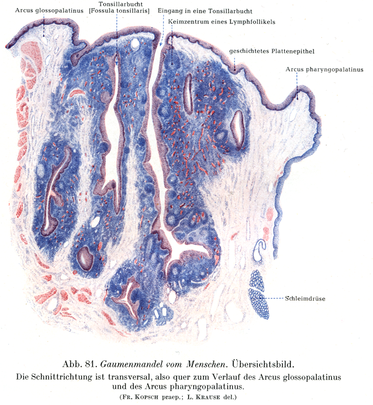 口腔に面した軟口蓋の粘膜は少数の(結合組織性)乳頭をもっている.口蓋垂では乳頭の数が比較的に多い.粘膜は扁平上皮で被われており,そのなかに味蕾がみられることがある.鼻腔に面する軟口蓋の粘膜は多数の乳頭をもっており,線毛上皮を被むつている.そのなかに扁平上皮が島状をなして所々にみられる.口蓋腺Glandulae palatinaeは前後両面ともはなはだ多く存在する.口蓋垂だけでもそれが12個あり,後面には40個,前面には100個もある.それは純粋の粘液腺である.(軟口蓋の後面(鼻腔がわ)にある腺は混合腺の構造を呈するものが多い,(小川鼎三))