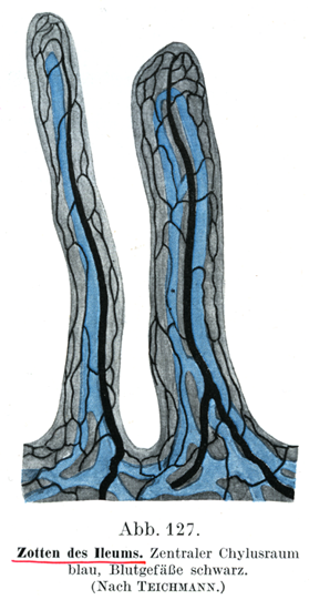 [図127]回腸の絨毛 中心乳ビ腔は青,血管は黒くしてある.(Teichmannによる)