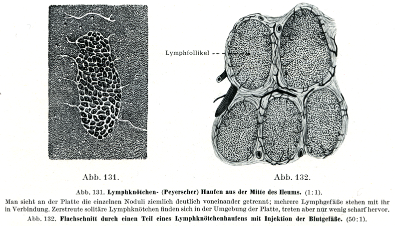しかし他の小枝は筋層を貫く.そのさい(Wolf-Heidegger 1942によると).血管の走るぐあいと結合組織の関係との両方で圧力に対して安全なようにできている.そして筋層に分布する諸枝を出した後に,粘膜下組織において平面的にひろがったよく発達した血管網をなす.この粘膜下の網から粘膜じしんに分布する血管がおこる.これはまず粘膜筋板を貫いて,ついで腸腺の底に接してまた平面的にひろがった網をつくっている.この網からリーベルキュン腺や絨毛やパイエル板への動脈がでるのである.筋層内の細い毛細血管は,縦走線維層と輪走線維層とのそれぞれの走り方にしたがった,長い網の目をもった2つの層に分れている.リンパ小節はその縁のところに毛細血管の網をもっていて,これから少数の管が内部に入るが,その中心部までいつも達するとは限らない.