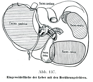 III. 近くの諸器官との位置関係として肝臓は上方は横隔膜に接触しているが,そのさらに上には右と左に肺,中央に心臓と心膜がある.肝臓のへこんだ内臓面は胃の前面の一部と小弯を被い,十二指腸上部と下行部の一部,右結腸曲を被っている.なお右の腎臓の上部と右の腎上体をも被う.これらすべての近接する器官によって肝臓にくぼみすなわち圧痕Impressionesができている.これは接触面Facles, Berührungsfelderともよばれる(図137, 139).それには食道圧痕・胃圧痕・十二指腸圧痕・結腸圧痕・腎圧痕・腎・上体圧痕Impressiones oesophagica, gastrica, duodenalis, colica, renalis, suprarenalisがある.