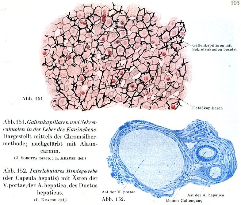 [図151]家兎の膵臓における毛細胆管と分泌液胞 クローム銀染色であらわしてある.アラウン・カルミソで後染色をほどこしてある(J. Sobotta作製)