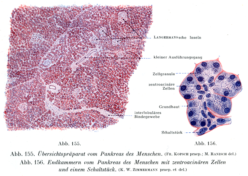 [図156]ヒトの膵臓の終末部 腺房中心細胞と峡部をもっている.(K. W. Zimmermann作製)