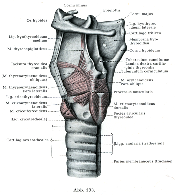 [図193]男の喉頭および気管の上部と舌骨,これらに付着する筋と靱帯.甲状軟骨の左板とこれに付着する靱帯は大部分取り去ってある.左からみる.(9/10)
