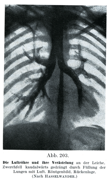 横隔膜は空気で充された肺によって下方に押しやられている.レントゲン写真.背位(Haßelwanderによる)