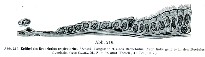 一つの肺小葉に所属する肺小葉気管支はその小葉のなかでかなり多数の細気管支に分れる.これらの細気管支は初めは薄い基礎膜の上にある丈の低い線毛上皮と固有層,および比較的よく発達している輪走筋層,それに粘膜下組織をもっている.そして肺胞管に移行する少し前に上皮の性質が変る.ここの上皮には線毛を失なった丈の低い細胞が群をなして集まっている(図216).これらの細胞の間には小さいウロコのような薄い板があって,これが肺胞のいわゆる呼吸上皮respiratorisches Epithelである.さらにこの細い枝の壁に半球形の壁龕つまりくぼみがある.これを肺胞Alveolenといい,肺胞管がもつ肺胞と同じものである.これらの点からして気管支のごく細い枝を呼吸細気管支Bronchuli respiratorliというのである(図218).