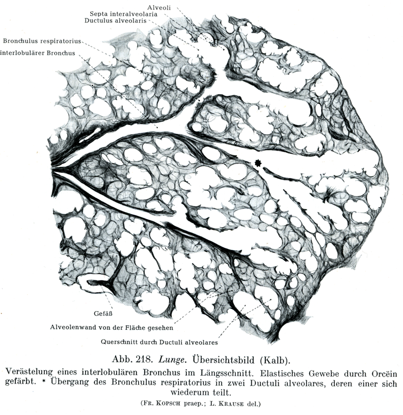 1本の小葉間気管支の分枝の縦断.弾性組織はオルツェイソで染められている.*呼吸細気管支が2本の肺胞管に移行するところ.肺胞管の1本はふたたび枝分れしている.