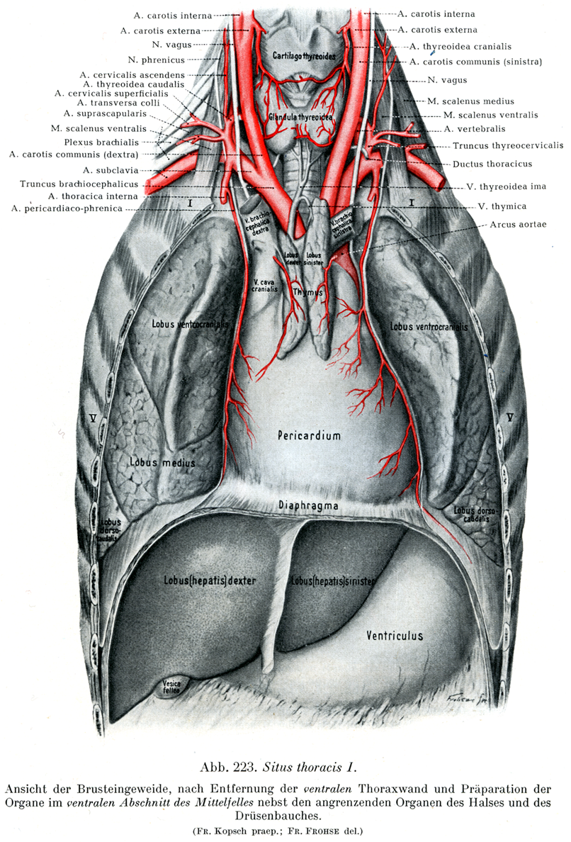 胸部内臓の概観.胸腔の前壁を取り去り前縦隔の諸岩官とこれに接する頚部および上腹部の器官を剖出してある.