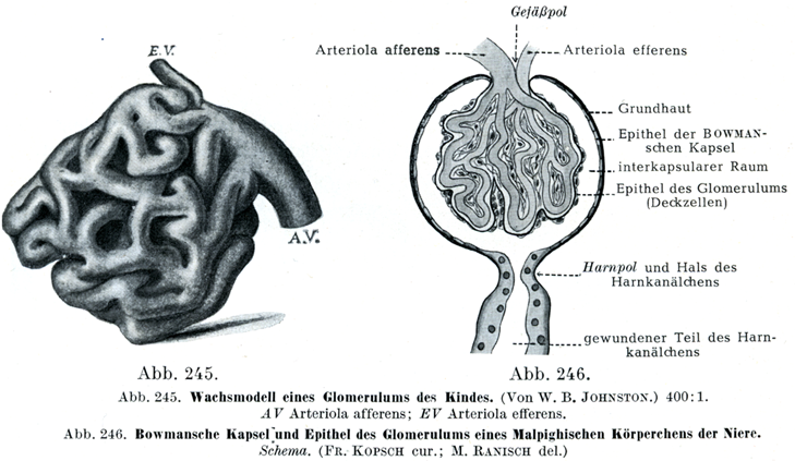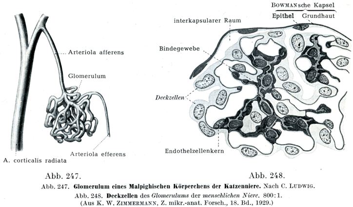 a)腎小体(マルピギー小体)Corpuscula renis, Malpighische Körperchen(図245~248, 250)マルピギー小体は球形をしていて0.13ないし0.22mmの直径を有し,それゆえ肉眼でも観察することができる.これは球形の糸球体Glomerulumという糸玉状の血管と糸球体嚢Capsula glomeruliすなわちボーマン嚢Bowmansche Kapselからなりたっている.