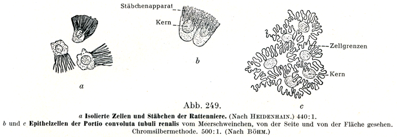 ボーマン嚢をなす基礎膜と単層上皮は尿細管の壁に続いている.尿細管の頚においては上皮の丈が高くなって短い円柱形となるが,尿細管の曲部ではそれがもっと高くなる(図246).上皮細胞の原形質が基礎膜に接する外方の部分に一見,垂直に走る棒状の線維のような糸がはっきりとみえる.(Heidenhein).このような細胞を“小棒上皮細胞Stäbchenepithelzellen”といい,この小棒の集りを“小棒装置Stäbchenapparat”という(図249 a, b, 256).尿細管の内腔に向う側には放射状に並んだ繊細な条のある縁がある.