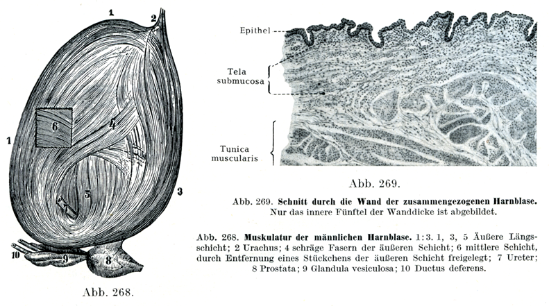 [図268]男の膀胱の筋肉 ×1/3 1, 3, 5 外方の縦走層;2 尿膜管;4 外層の斜走線維;6 中層(外層の一部を取り除いて剖出);7 尿管;8 前立腺;9 精嚢腺;10 精管.