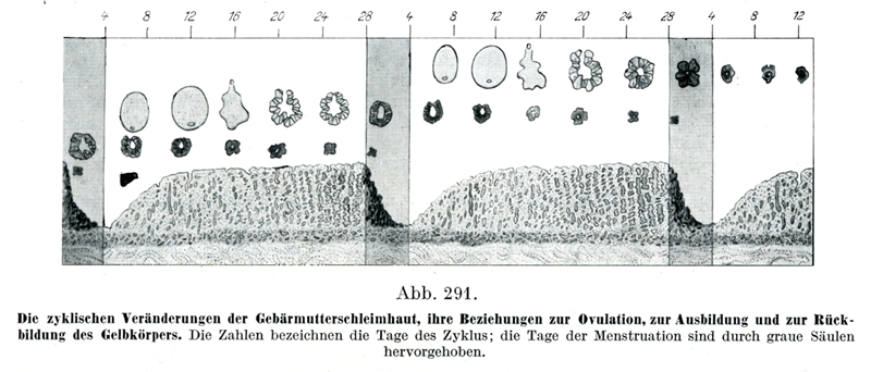 月経周期を次の各期に分けている.1. 月経期Menstruation(第1~4日目),2. 月経後期Postmenstruum(第5~12日目),3. 中間期Intervall(第12~17日目),4. 月経前期Praemenstruum(第17~28日目).これらの各期に応じて子宮の粘膜は一定の特徴ある変化を示している.月経の直後には粘膜は薄い.月経後期には卵胞ホルモンの影響を受けて粘膜は正常の厚さにかえり,中間期のあいだはその厚さを保っている.月経前期は主に黄体ホルモンの作用する時期で粘膜はだんだん厚くなり,5倍ないし8倍(10mmまで)になる.伺時に腺も長くなり,その走り方も独特なうねりをしており,上皮も丈の高い円柱形となる.粘膜は血液を豊富に受け入れ,月経前期の終りに近づくと多少とも強い出血が組織のなかにおこる.