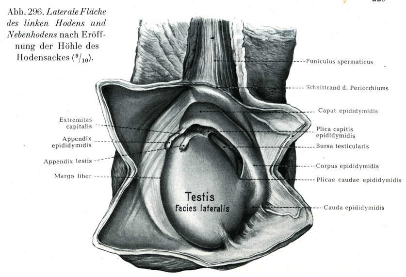 [図296]左の精巣と精巣上体の外側面 陰嚢を入れる腔所の被膜を切り開いたところ.(9/10)