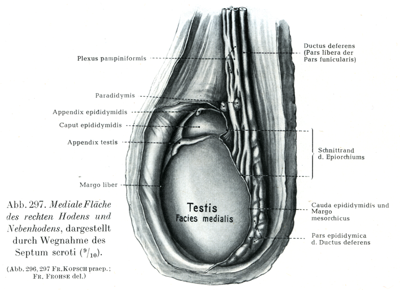 [図297]右の精巣と精巣上体の内側面 陰嚢中隔を除去して剖出したもの. (9/15)