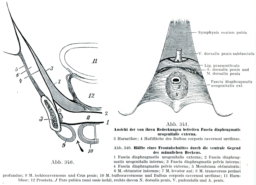 骨盤の前方部をとおる前頭断面(図340)でこの2つの筋膜が明かにみられる(1, 2).深会陰横筋(8)はこれらの2つの間に包まれている.内尿生殖隔膜筋膜の上には中央部に前立腺(12)がのっており,側方には肛門挙筋(7)の前方部がのっている.この筋はそれ自身がまた内骨盤隔膜筋膜(3)で被われている.内骨盤隔膜筋膜は前立腺の側面に放散していて,そのさい内尿生殖隔膜筋膜とも合している.外尿生殖隔膜筋膜の大部分は陰茎海綿体と尿道海綿体,およびこれらを包んでいる坐骨海綿体筋(9)と球海綿体筋(10)によって被いかくされている(図333).