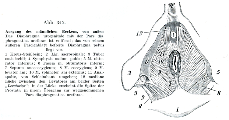 1 仙尾骨;2 仙棘靱帯;3 坐骨結節;4 恥骨結合;5 内閉鎖筋;6 内閉鎖筋膜;7 肛門尾骨中隔;8 尾骨筋;9 肛門挙筋;10外肛門括約筋;11肛門裂;粘膜によって囲まれている;12両側の肛門挙筋のあいだにある正中部め隙間,すなわち“挙筋門Levatortor”;この隙間には前立腺の尖端が尿道の隔膜部(これは取り除いてある)に移行するところがみえる.