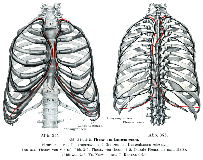 胸膜頂と胸骨および脊柱のところでは肺の界は呼気と吸気のあいだも胸膜線と一致している.ただ左肺の心切痕のところでは肺の鋭い前縁が胸膜線に達しないのが普通である.つよく空気をはきだした状態,および死体においては肺の下界はだいたいに直線を画いていて,右は第6肋骨の胸骨付着点,左は第6肋軟骨の中央から始まり,後方は第11肋骨の付着部,すなわち第10胸椎の棘突起の高さで終わっている.この線は脊柱から遠くない所で第11肋骨をよぎつている.肺の下界も肋膜下線のばあいと同じで,左がいつも右よりやや下方にある.