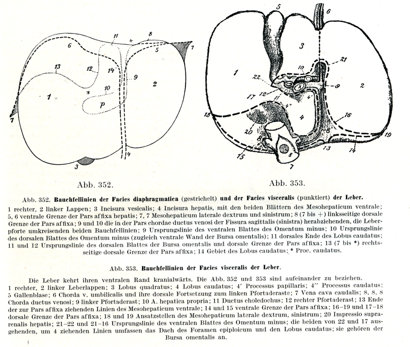 1 右葉;3 左葉;3胆嚢切痕;4 肝切痕と肝鎌状間膜の両葉;5, 6肝臓の付着部の前界;7, 7 右と左の三角間膜;8(7から10まで)付着部の左の後界;9と10 (左)矢状裂の静脈管索部を下行し,さらに肝門をとりまく2つの腹膜線;9 小網の前葉の起始線;10 小網の後葉(すなわち網嚢の前壁)の起始線;11尾状葉の後端;11と12網嚢の後葉の起始線と付着部の後界;13(7から*まで)付着部の右の後界;14 尾状葉の領域;* 尾状突起.