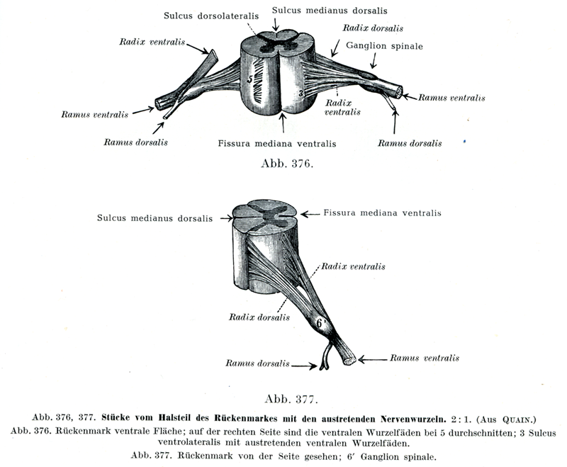 [図376, 377]脊髄の頚部の一部とそこから出る神経根×2(Quainより)