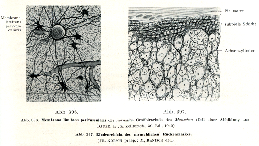 [図396]血管周囲境界膜 ヒトの正常な大脳皮質から(Bauer, K., Z. Zellforsch., 30. Bd.,1940の図の一部);