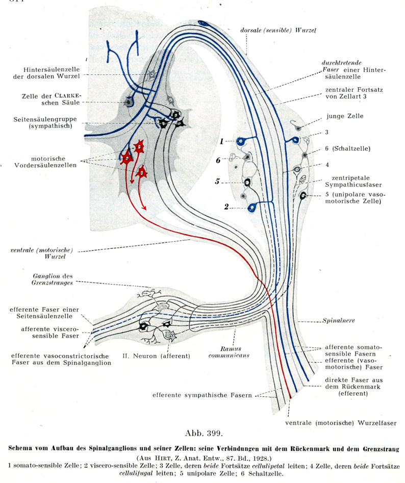 [図399]脊髄神経節の構成およびその細胞の模型図:脊髄および交感神経幹との結合関係を示す(Hirt, Z. Anat. Entw.,87. Bd.,1928より)