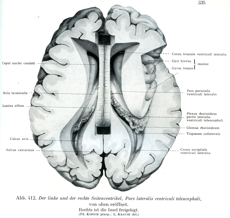 [図412]左と右の側脳室Pars lateralis ventriculi telencephali,上方から開いてある.右側では島をあらわしてある.