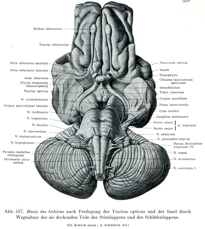 [図417]脳底を示す. 視索および島はこれらを被う前頭葉および側頭葉の部分を取り去って剖出してある.