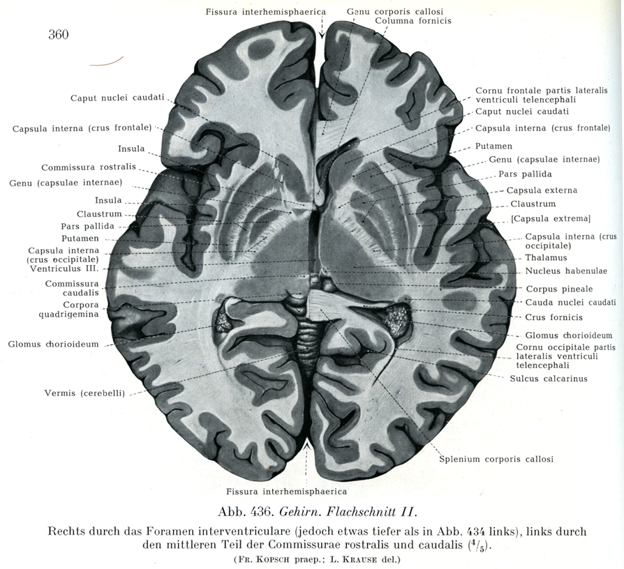 [図436]脳,水平断面II 右側は室間孔を通り(しかし図434の左側よりもいくらか深い),左側は前と後の両交連の中央部を通る切断面.(4/5)