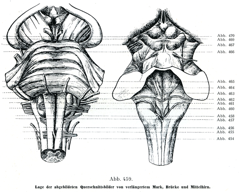[図459]延髄,橋および中脳の各横断図の高さを示す.