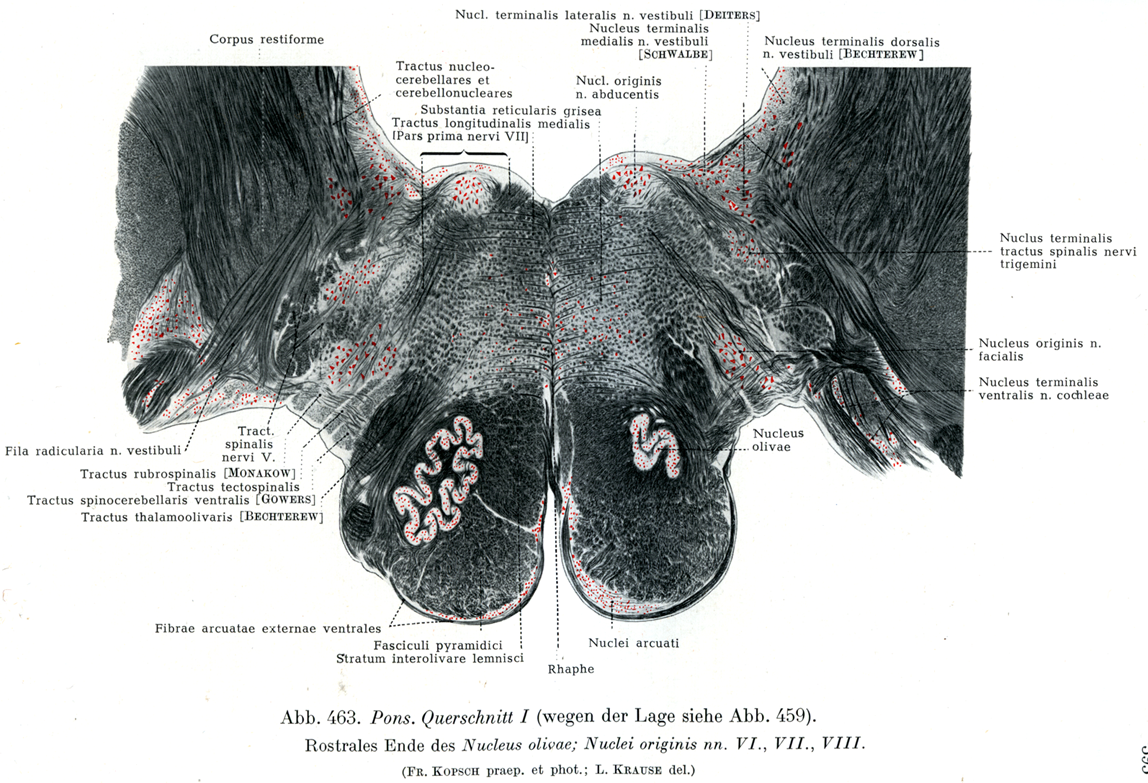 オリーブ核Nucleus olivaeの上端の高さ,外転神経核,顔面神経核,内耳神経核を示す.